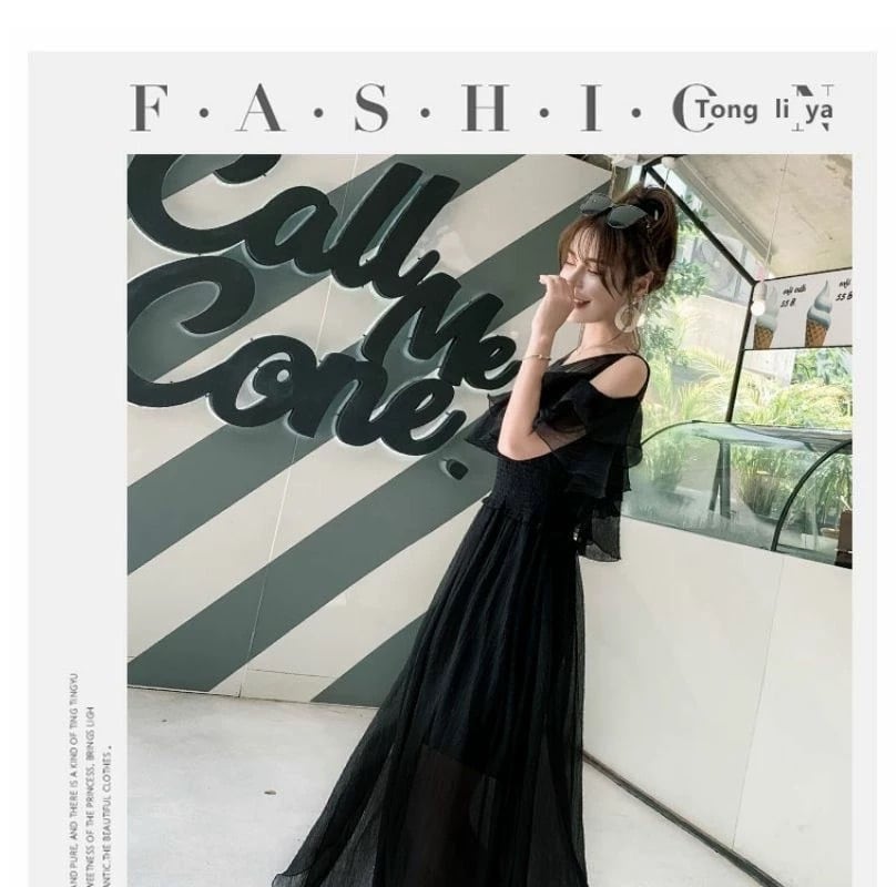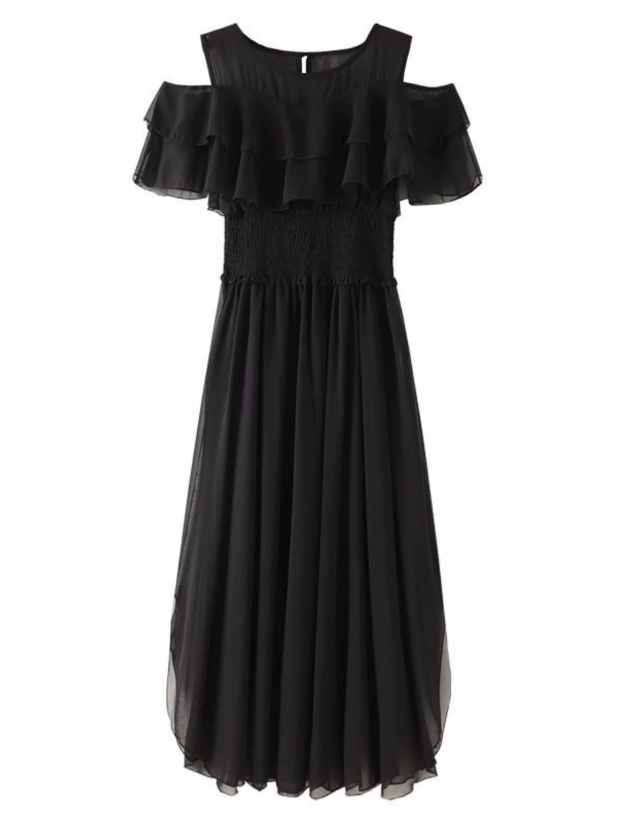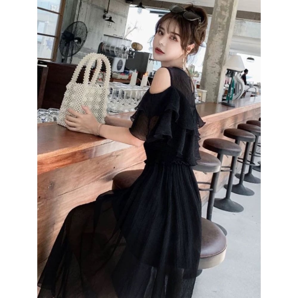 お袖のフリルと透け感あるお素材がキュートなオフショルパーティードレス。