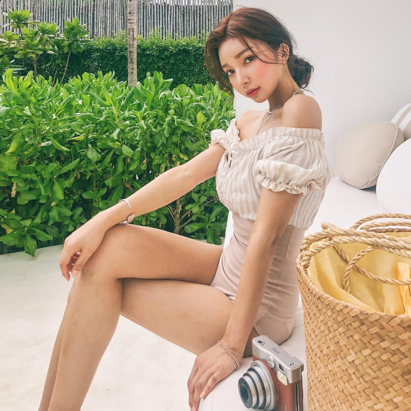 大人可愛いギンガムチェック&ストライプ柄のワンピース水着。