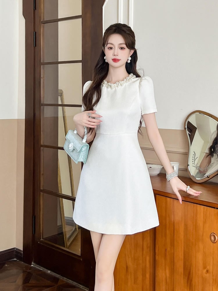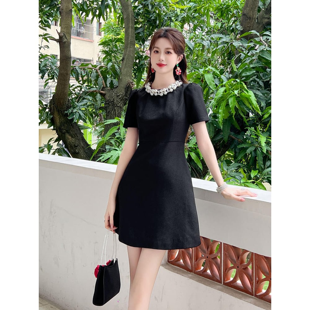 襟元のパールが大人可愛いミニ丈のパーティードレス。
