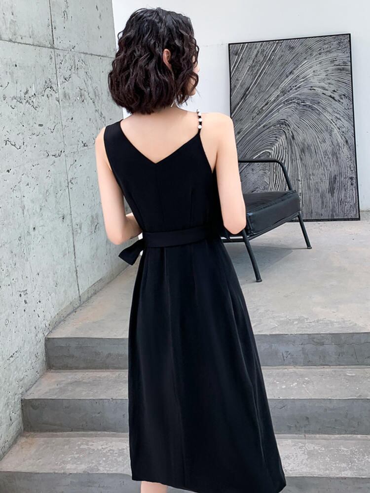 バストのカシュクールデザインとウエストリボンでフェミニンな印象に。