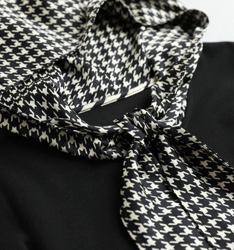 千鳥格子のスカーフがさりげなくおしゃれ度を上げてくれるワンピース。