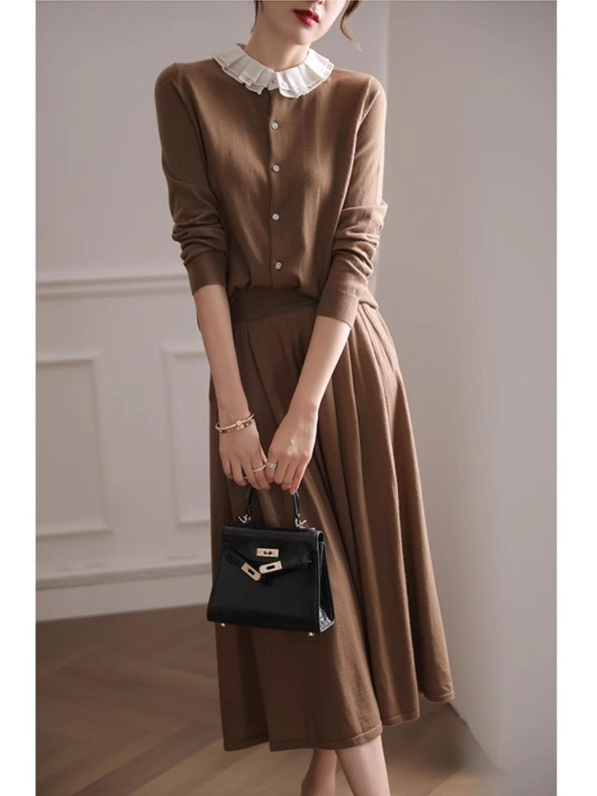 大人エレガントなフリル襟カーディガン+フレアスカートのセットアップ。