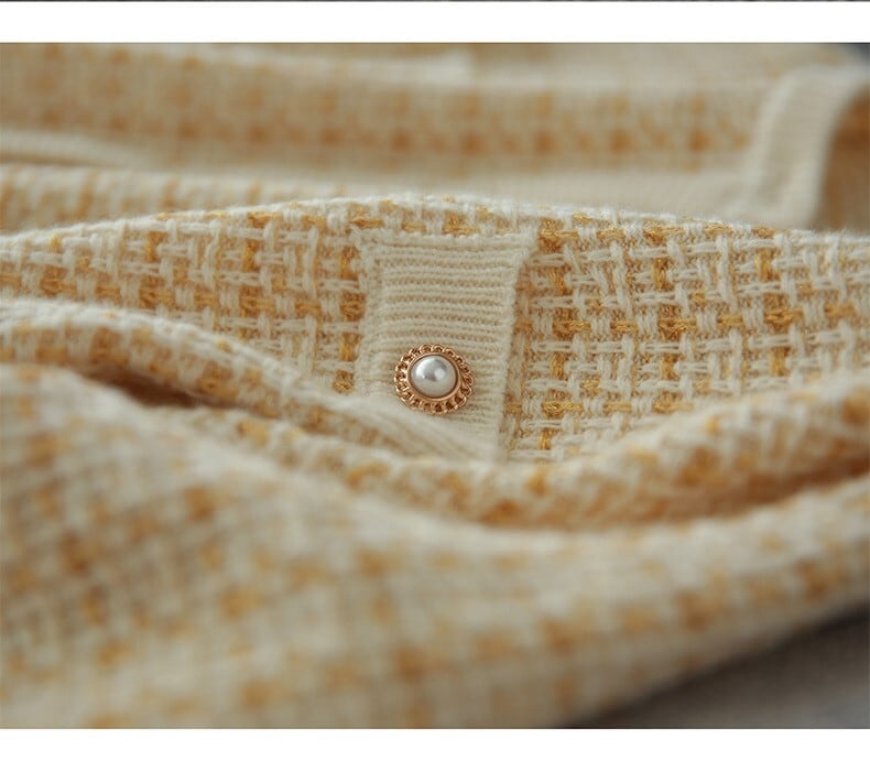 下半身をすっきり見せる!タイトなツイードスカート+ニットのセットアップ。