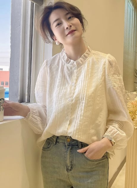 襟とバストまわりのフリルが大人可愛いシンプルブラウス。