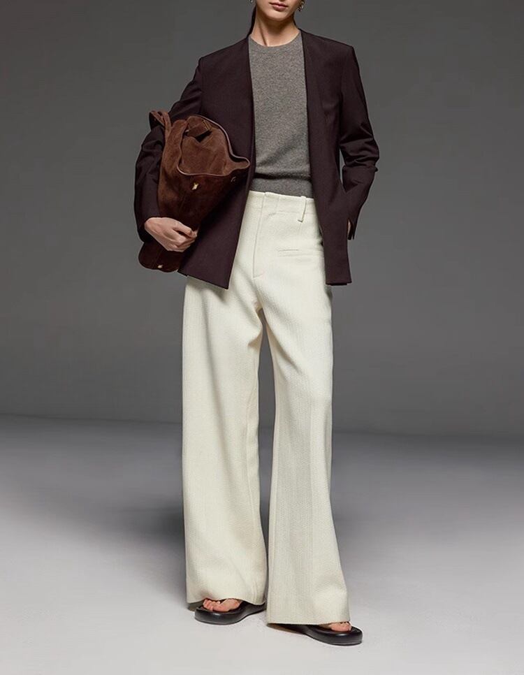クールでマニッシュなノーカラージャケット+パンツのセットアップスーツ。