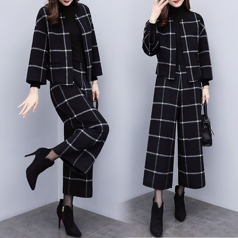 上品なショート丈ジャケット+ワイドパンツのセットアップスーツ。