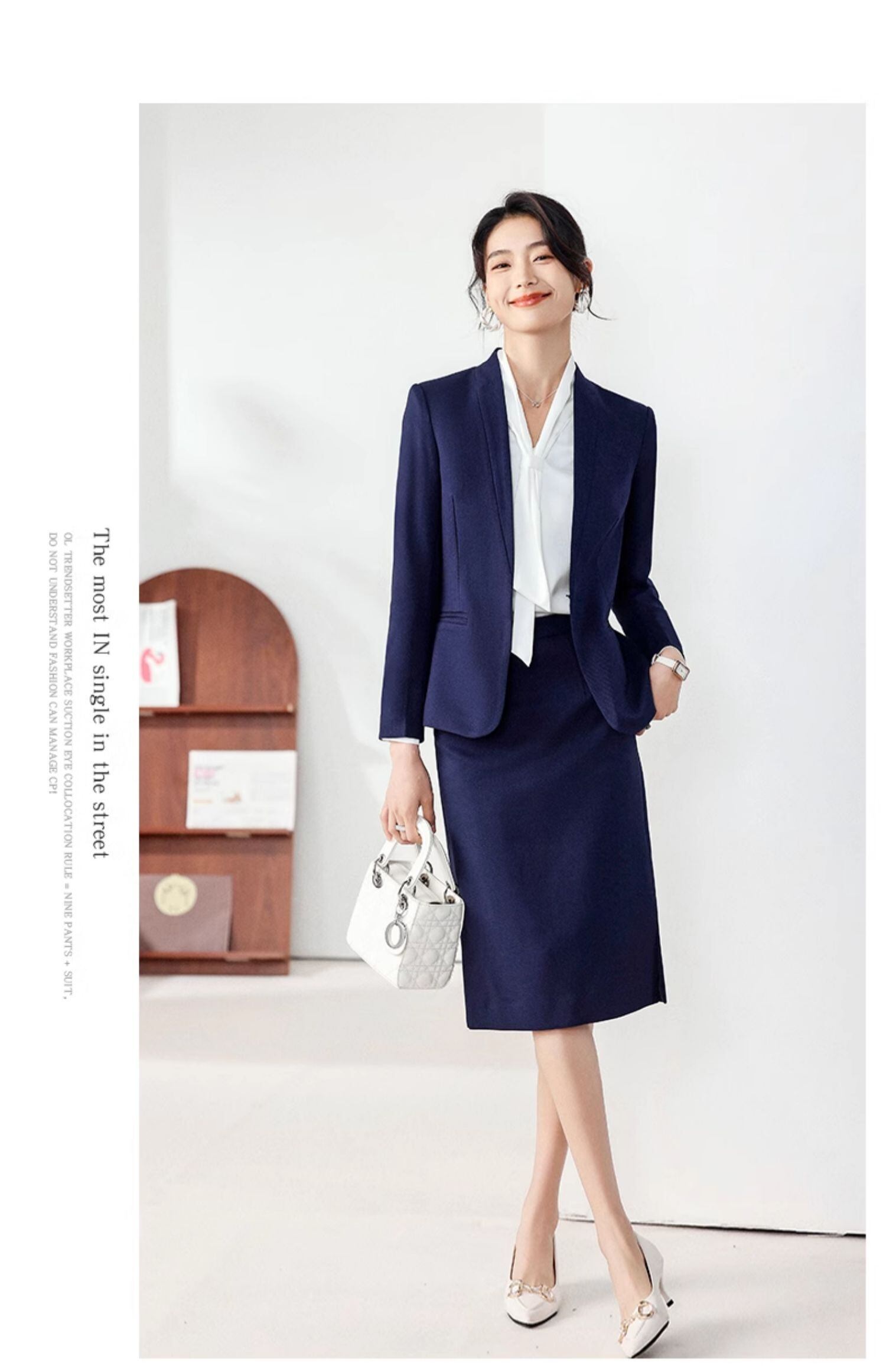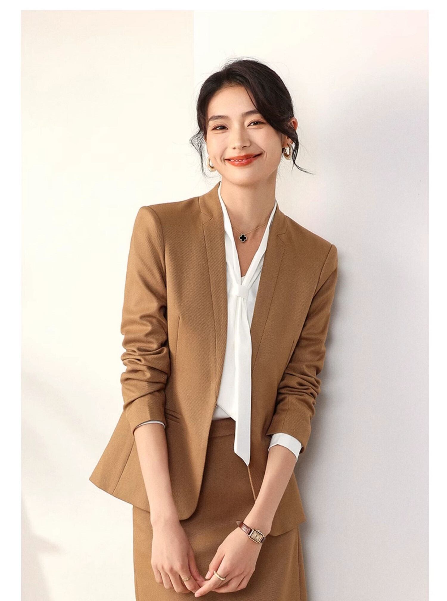 マニッシュなノーカラージャケット+パンツorスカートのセットアップスーツ。