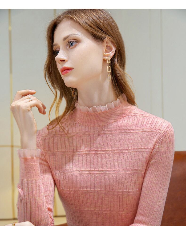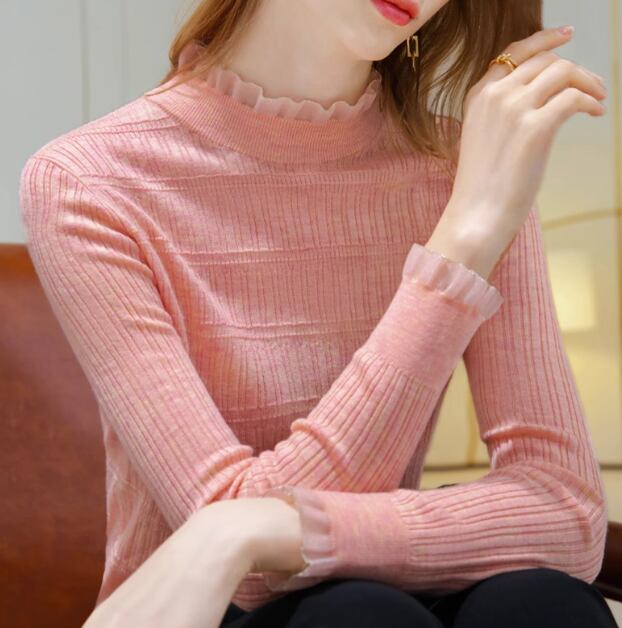 襟ぐりとお袖のフリルが可愛らしいリブニットセーター。