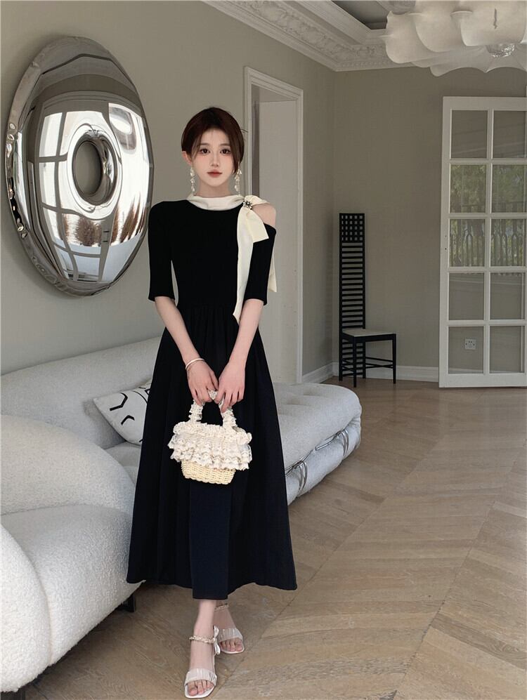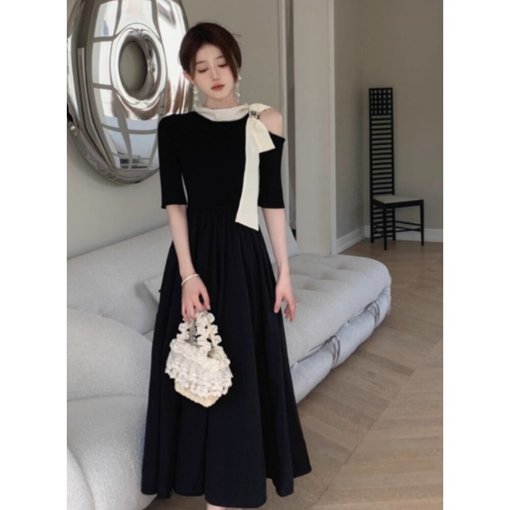 肩のカットアウト&リボンがフェミニンな印象をあたえるワンピースドレス。