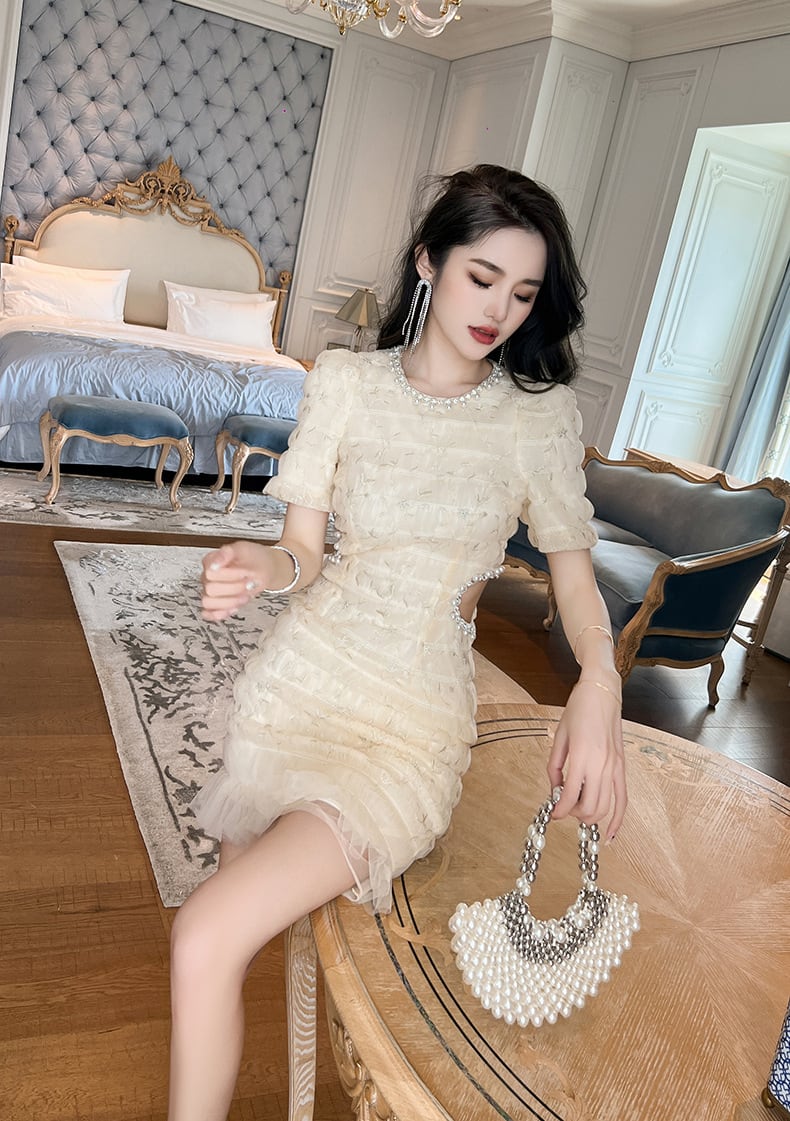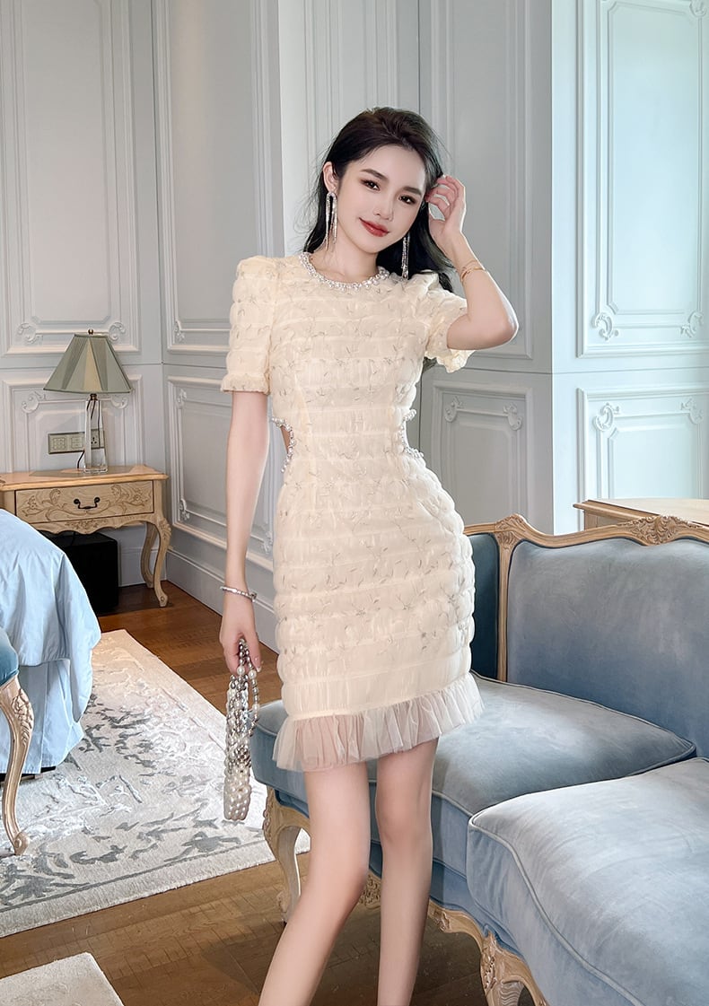 メッシュ素材の大人可愛いミニ丈パーティードレス。