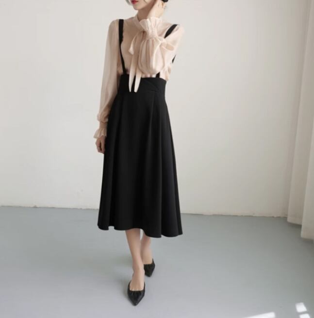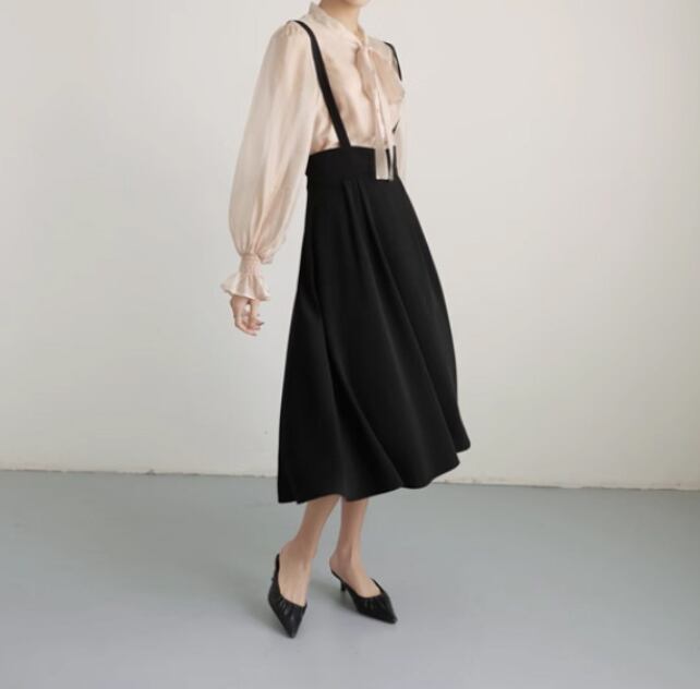 上品なスタイルが叶うボウタイブラウスやフリルブラウスとのコーデがおすすめ。