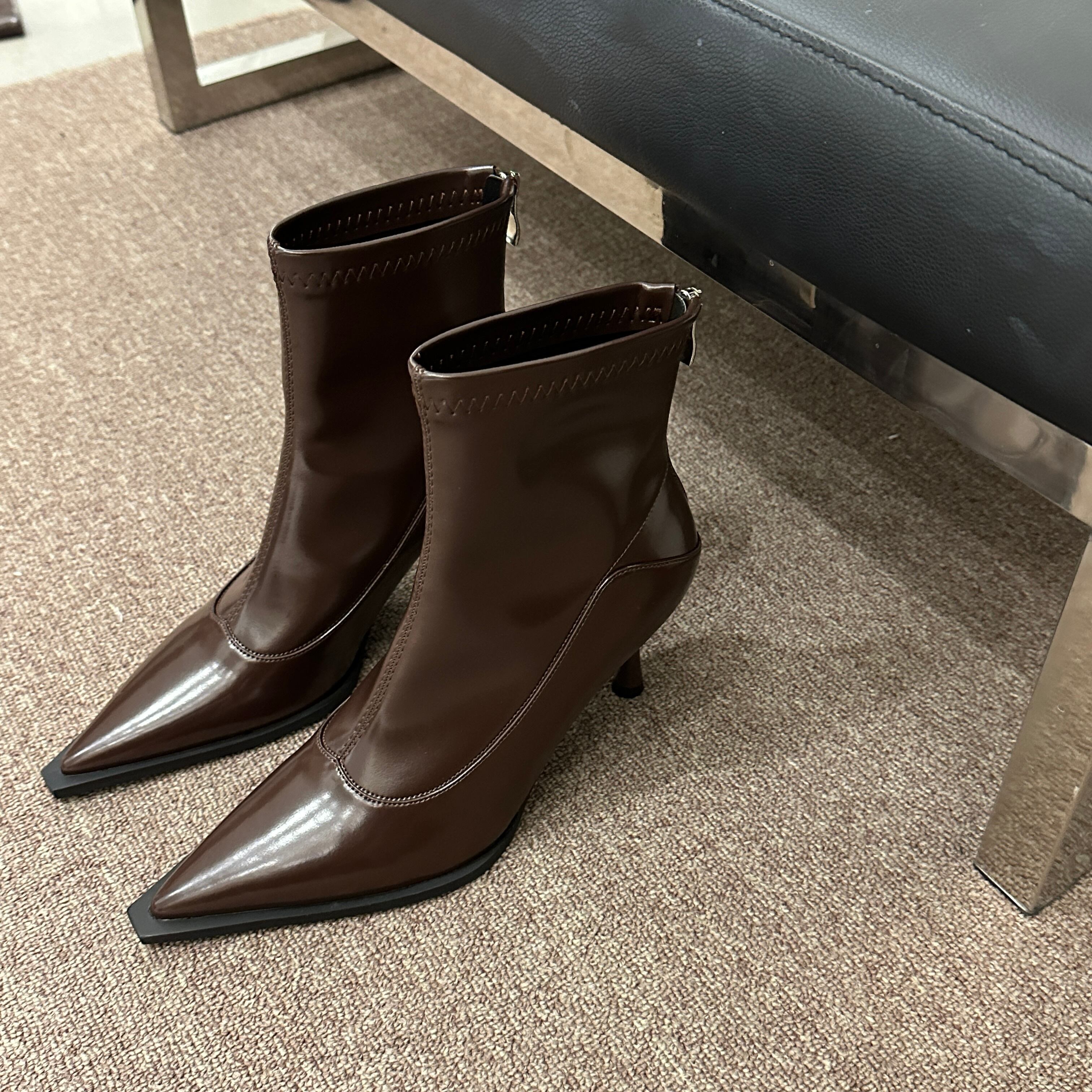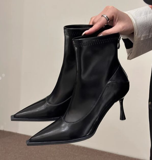 大人エレガントでシンプルなポインテッドトゥのショート丈ブーツ。