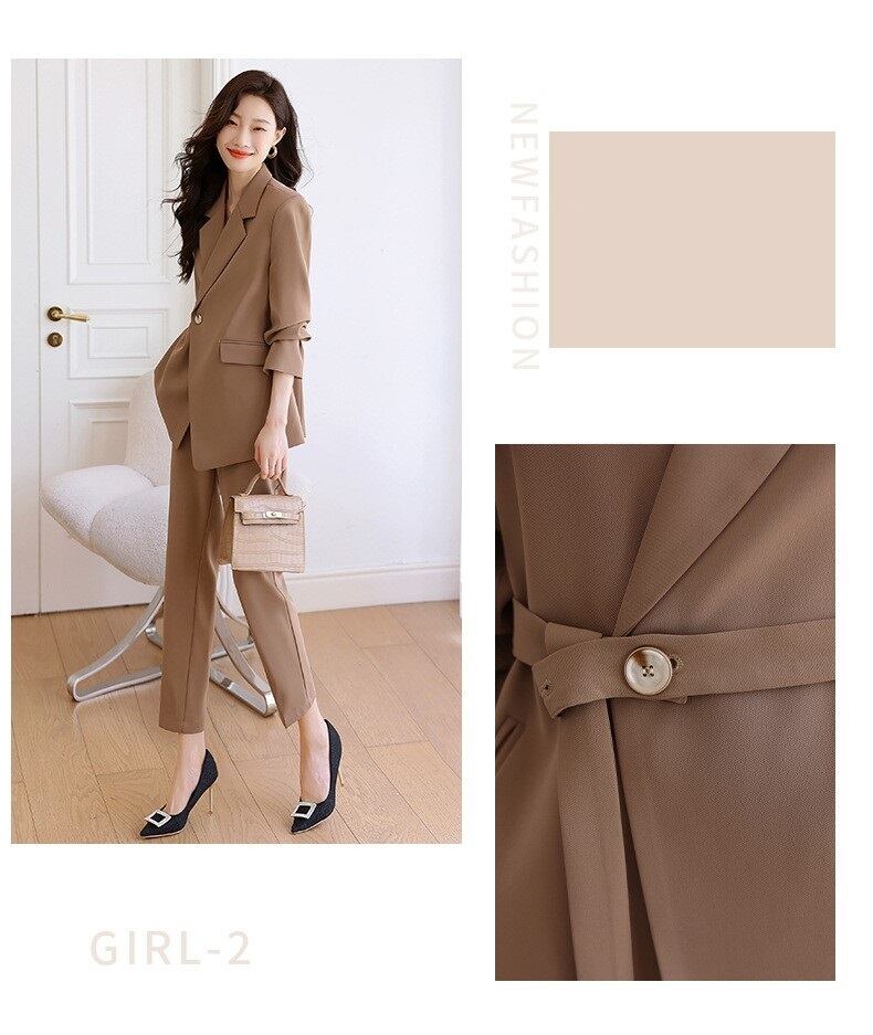 ウエストベルトがポイントのアシンメトリーなパンツスーツ。