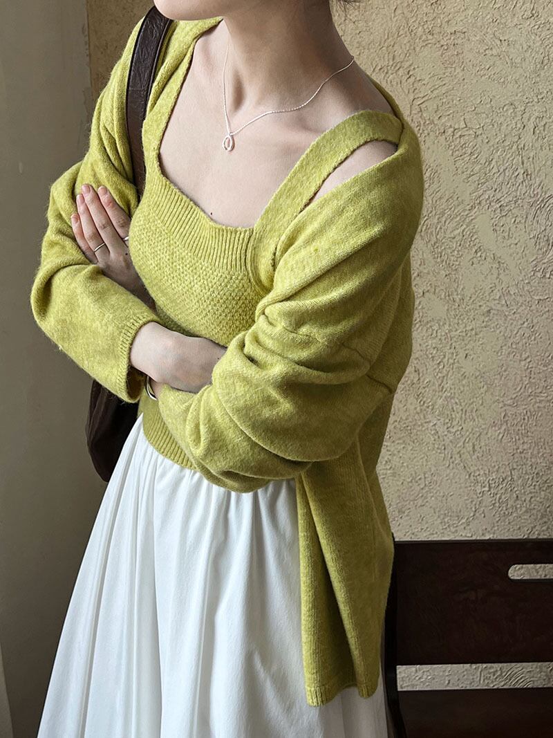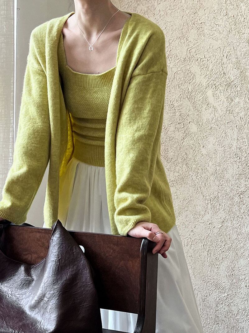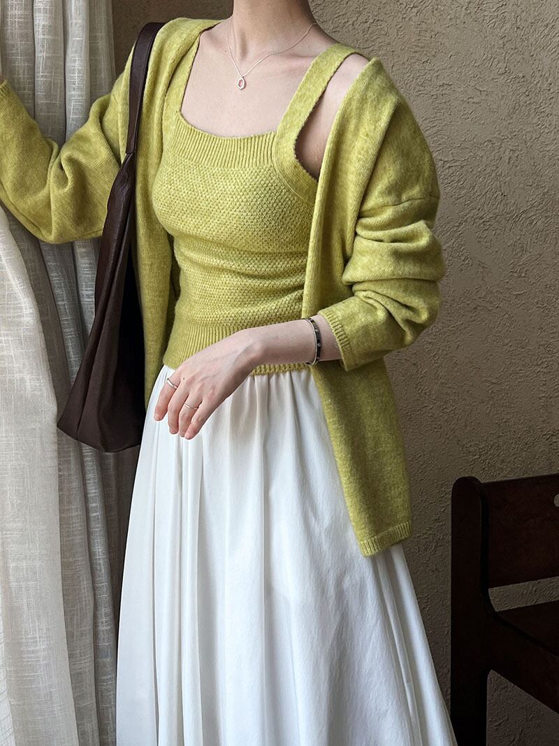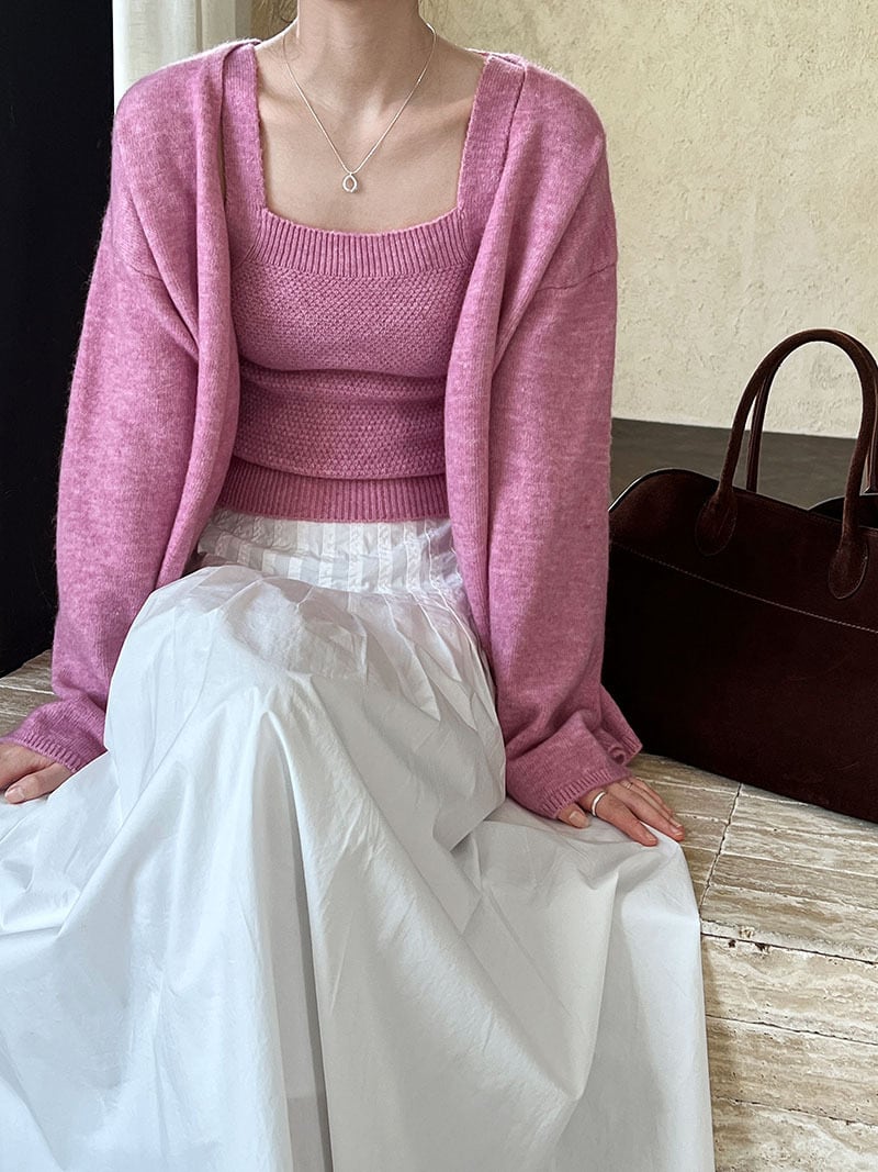 ぴったりフィットしたキャミソール+カーディガンのセットアップ。