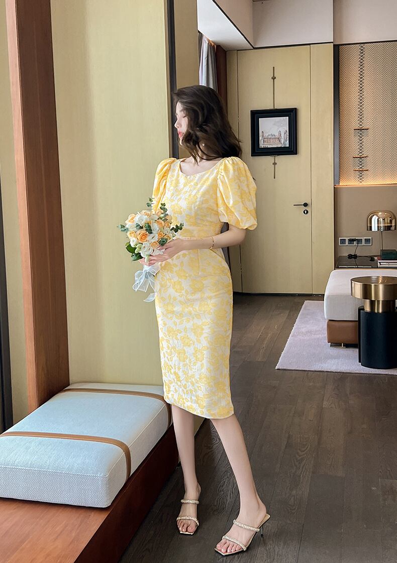 大人可愛いレモンカラーの花柄ワンピースドレス。