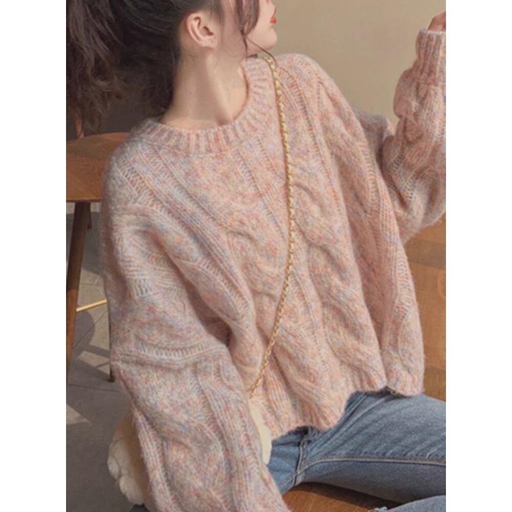 大人可愛いピンクカラーのケーブルニットセーター。