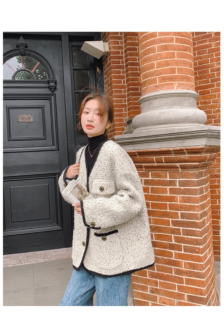 パイピングが大人可愛いミックスツイードのボアジャケット。