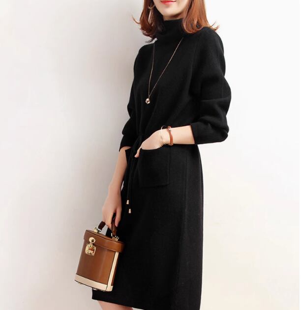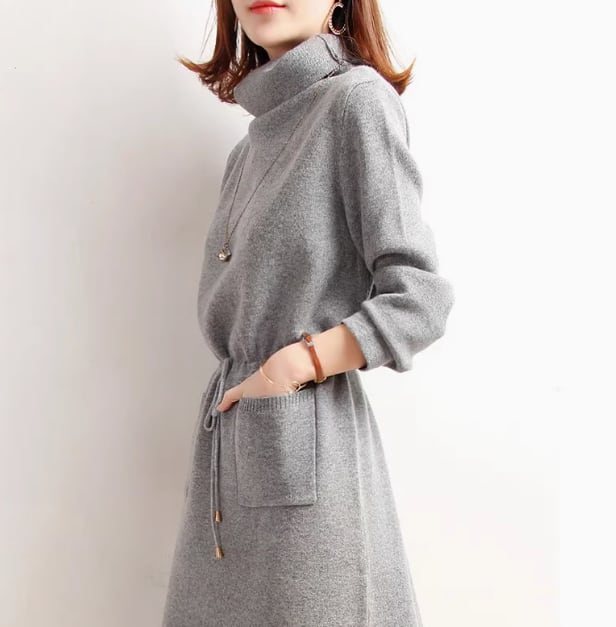 大人エレガントなミディ丈のタートルネックニットワンピース。
