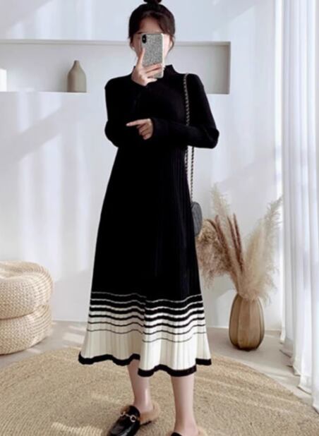 裾のボーダーが可愛らしいハイネックのリブニットワンピース。