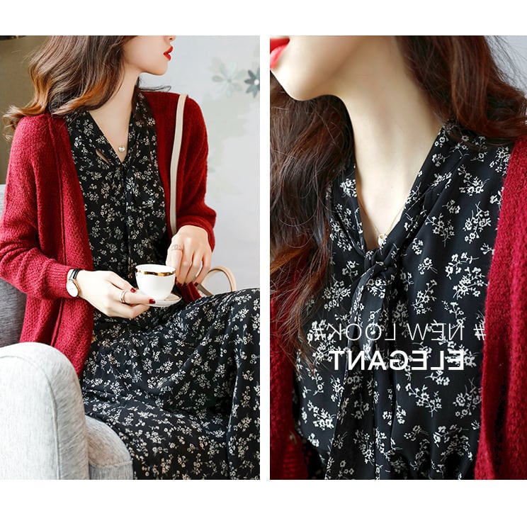 大人エレガントなカーディガン+花柄ワンピースのセットアップ。