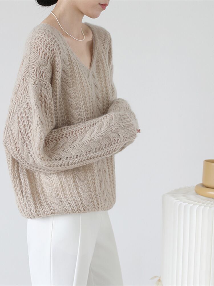 透け感あるお素材がフェミニンな印象を与えるケーブルニットセーター。
