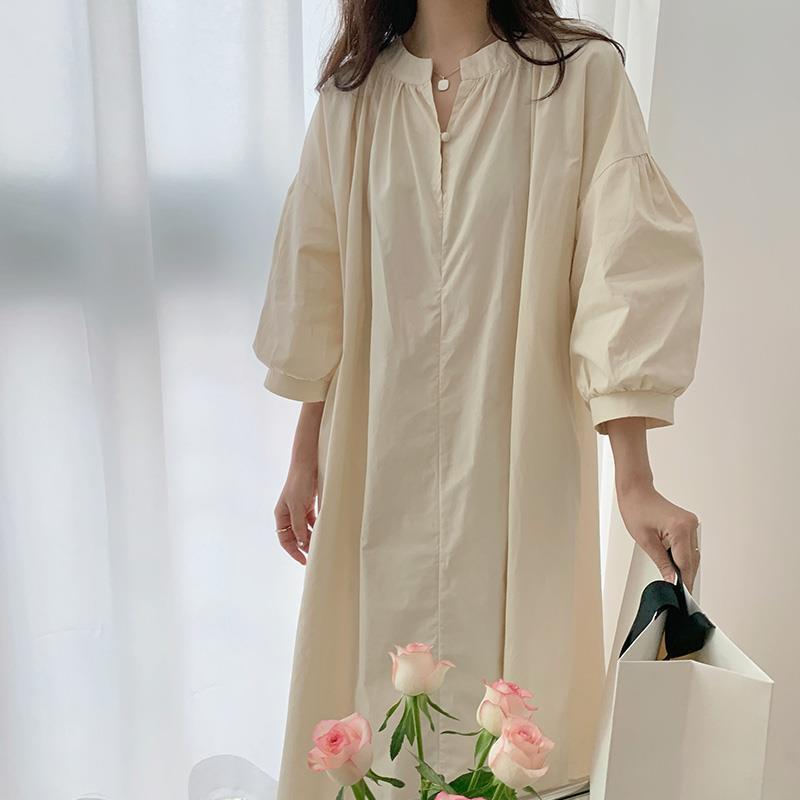 ゆったりシルエットが魅力のキーネックのワンピース。