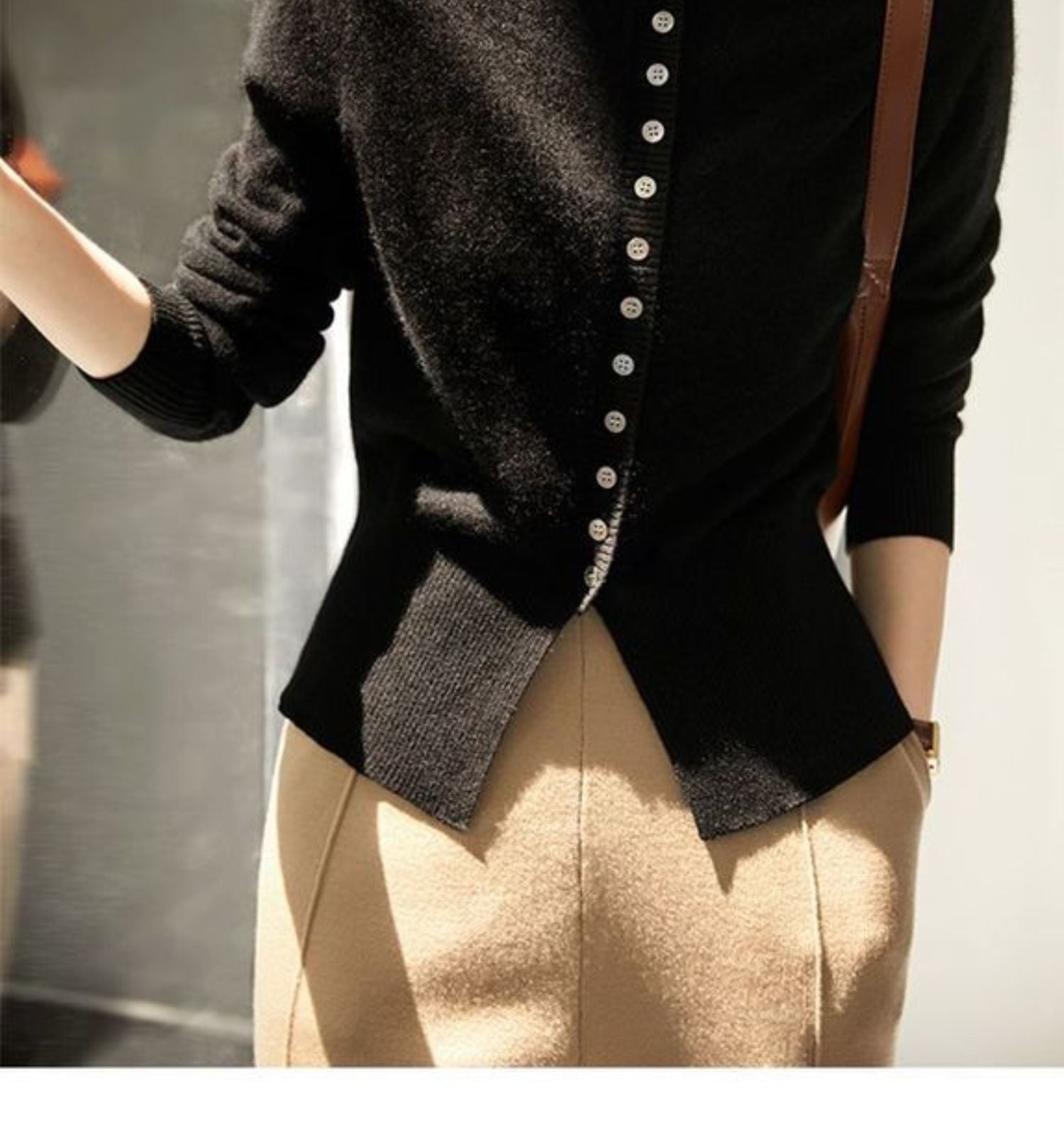 幾重にも連なったボタン使いが印象的な大人エレガントなカーディガン。