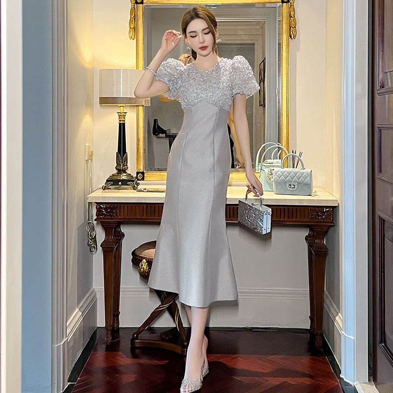 【パーティードレス】パーティードレス 結婚式 お呼ばれ ドレス マーメイド 結婚式のお呼ばれ お呼ばれ ワンピース 20代 30代 40代 卒業式 謝恩会 成人式 同窓会 フォーマルドレス 袖あり ミモレ丈 体型カバー お呼ばれ 二次会 フォーマルワンピース シンプル おしゃれ グレー ベージュ S M L
