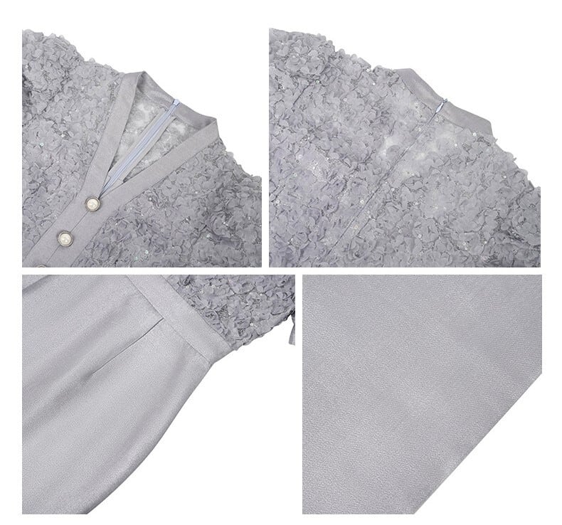 トップのお花モチーフがエレガントなvネックのパーティードレス。