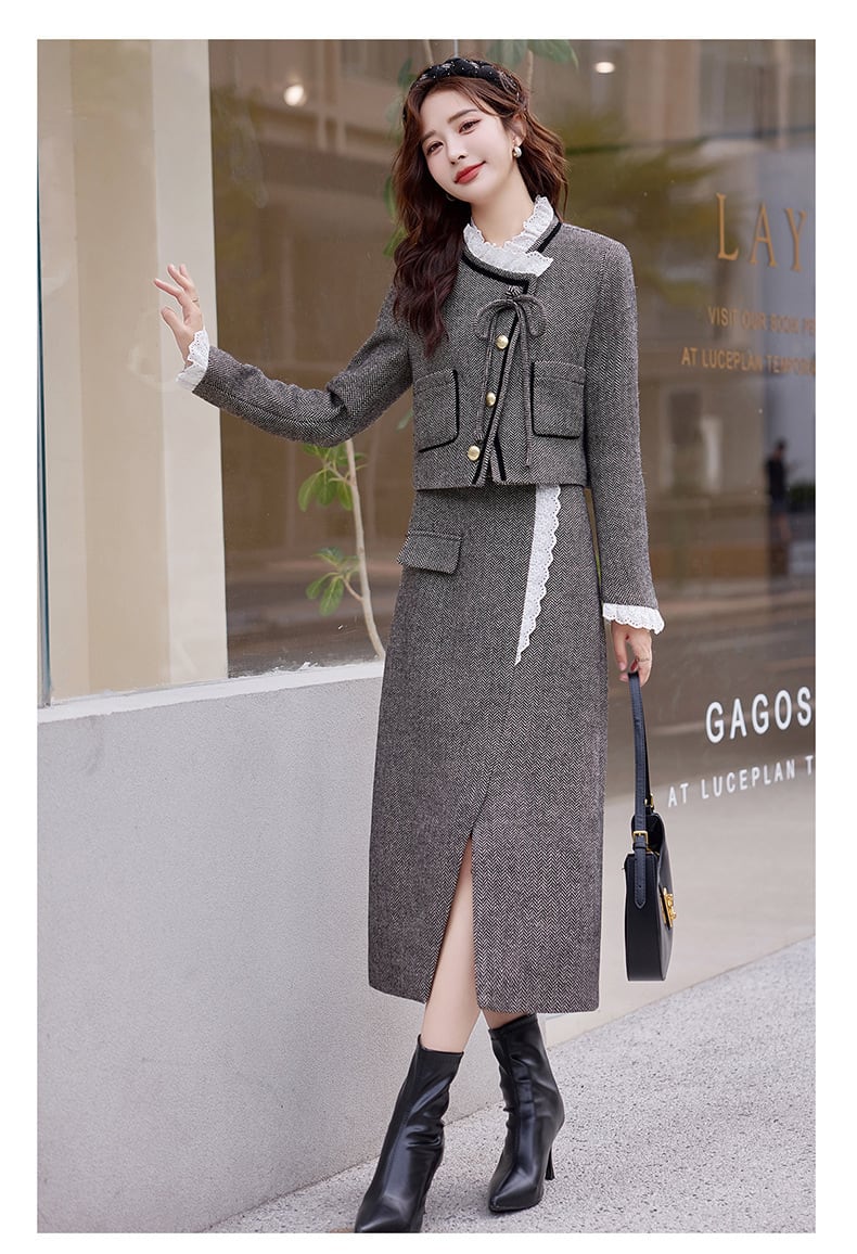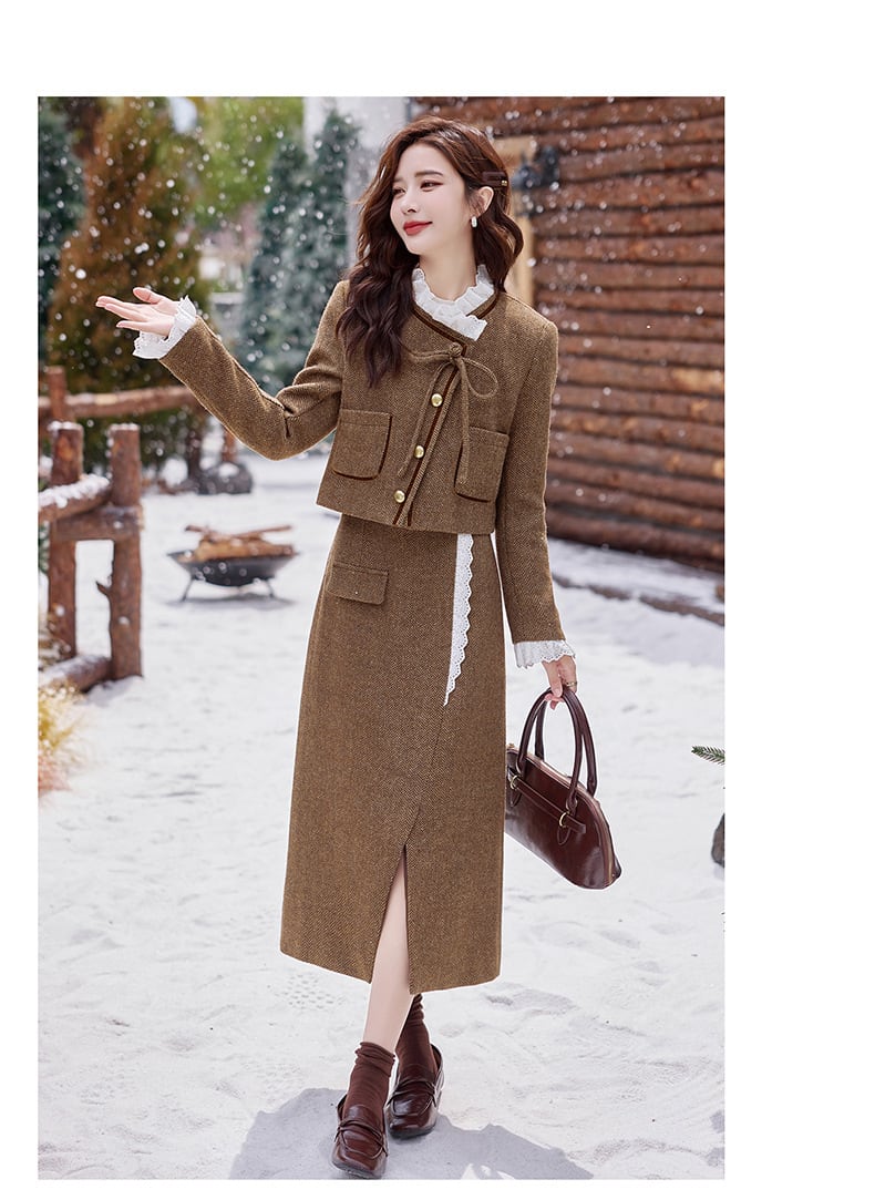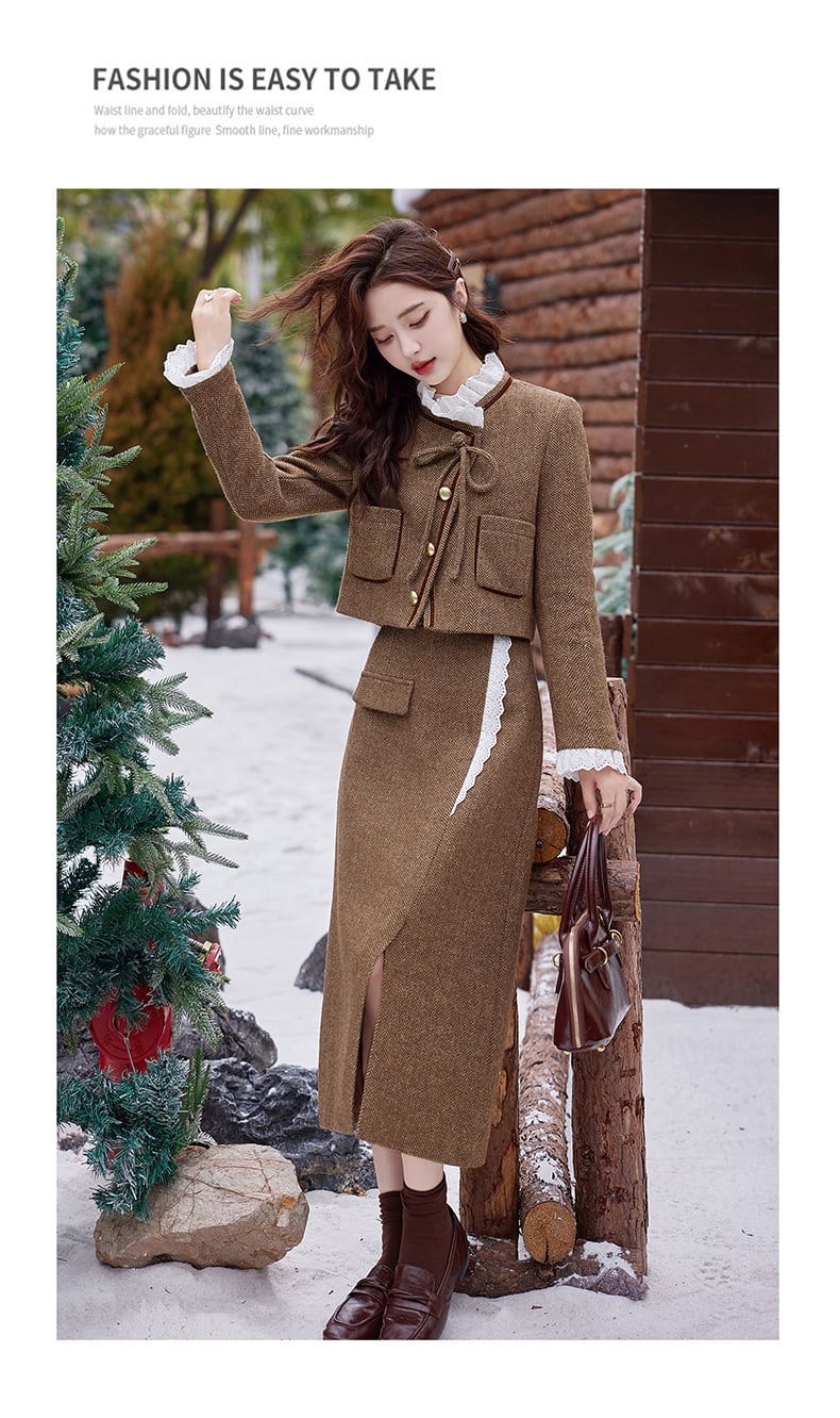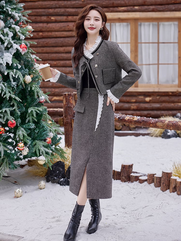大人可愛いツイードジャケット+スカートのセットアップ。