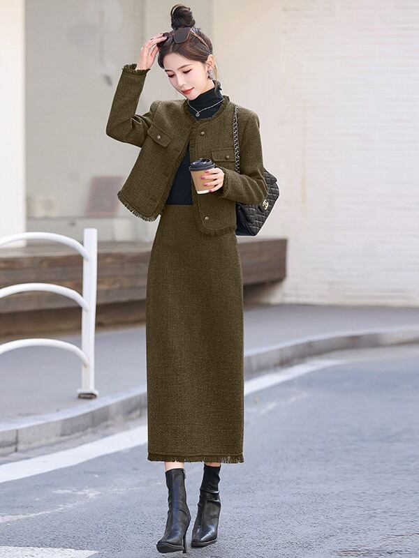 大人可愛いツイードジャケット+スカートのセットアップ。