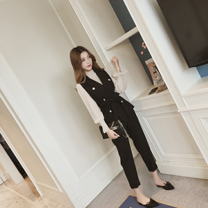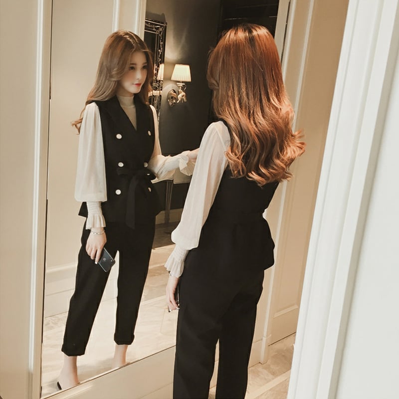 大人可愛いベスト+ブラウス+テーパードパンツのセットアップ。