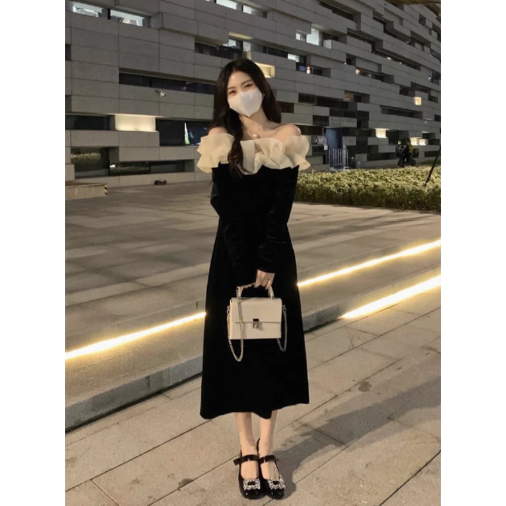 大人エレガントなオフショルダーのバイカラーパーティードレス。