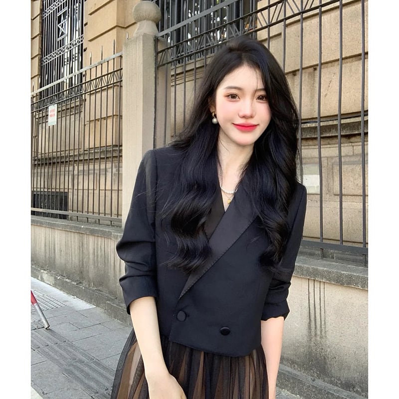 ショート丈ジャケットとハイウエストスカートでバランスよく着こなせます。