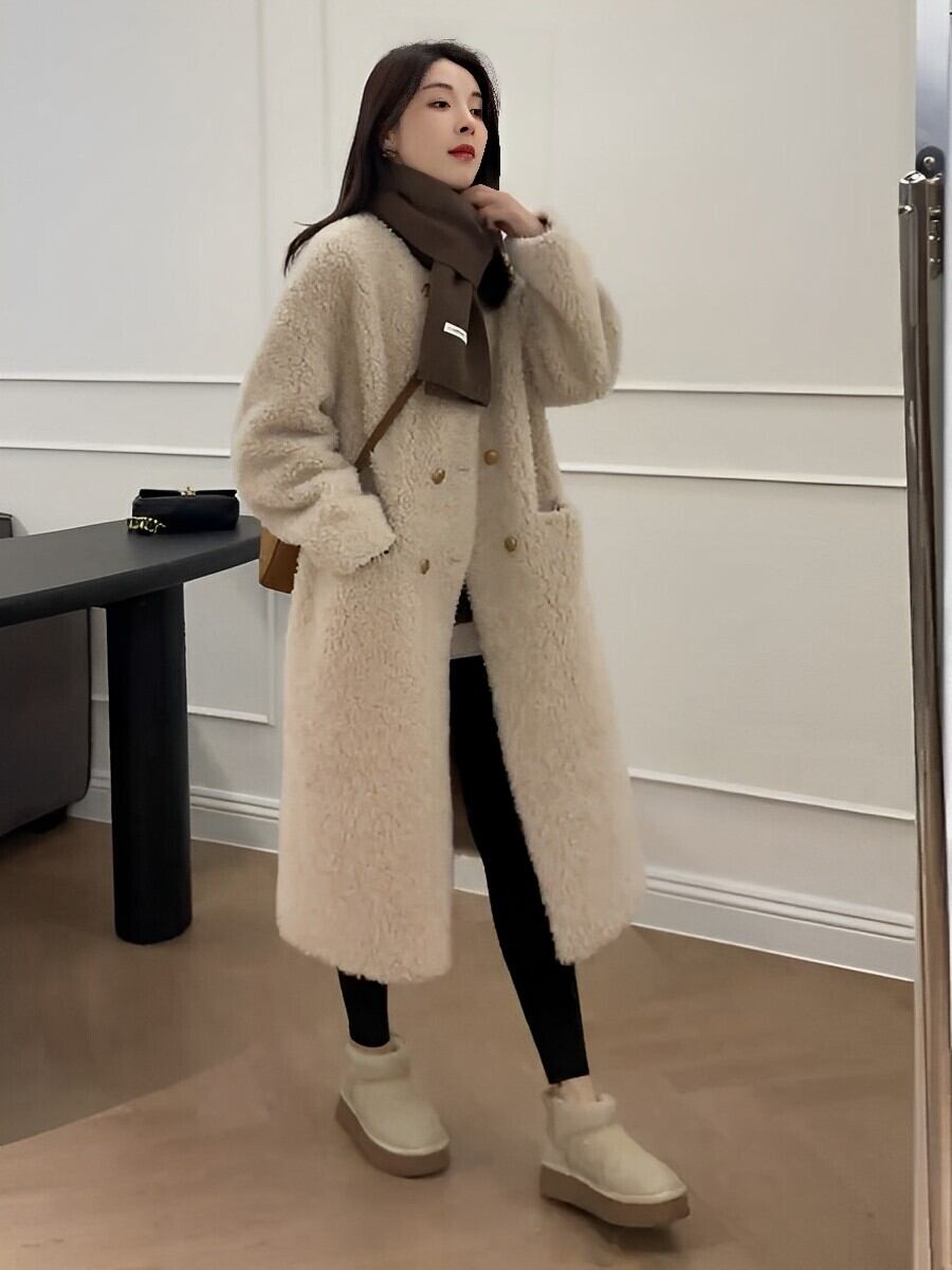 大人可愛いロング丈のノーカラーボアコート。
