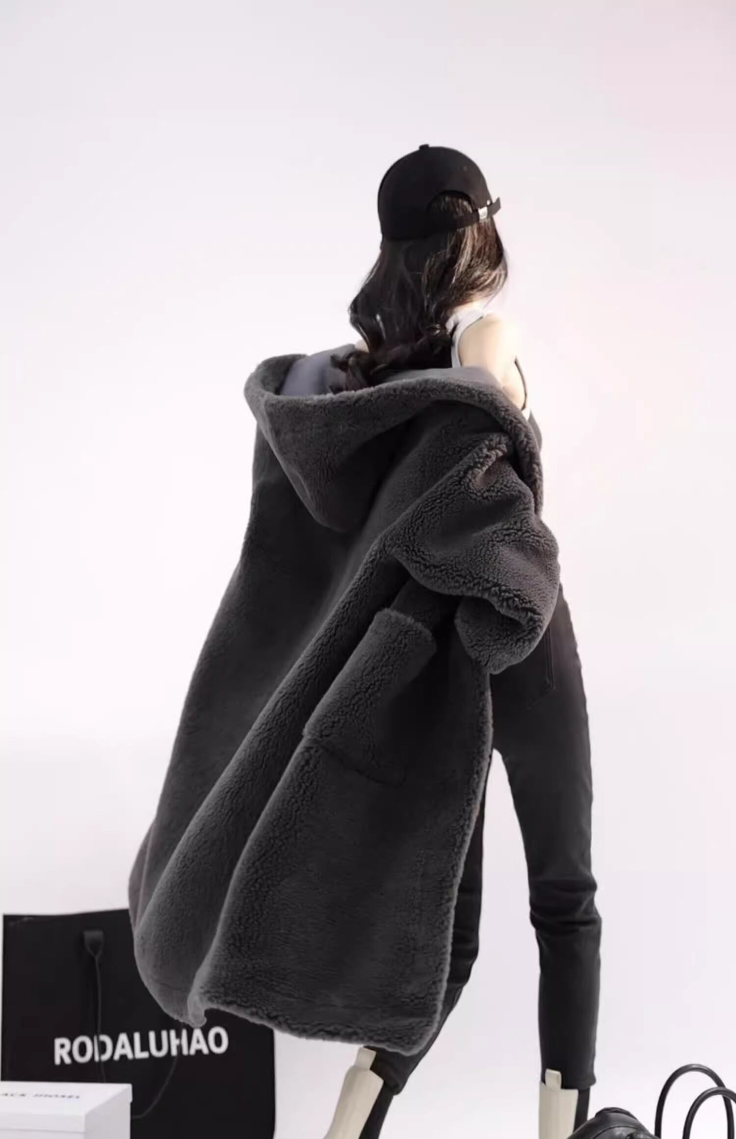 大人可愛いロング丈のフード付きボアコート。