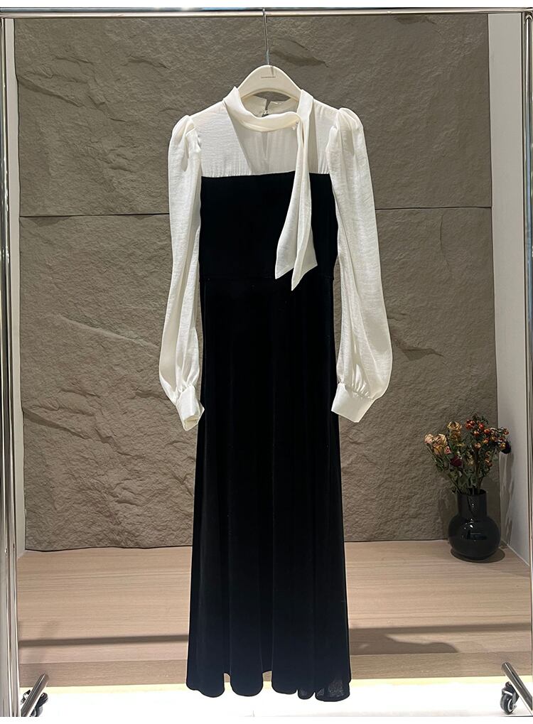 お首まわりのリボンが大人可愛いバイカラーのパーティードレス。