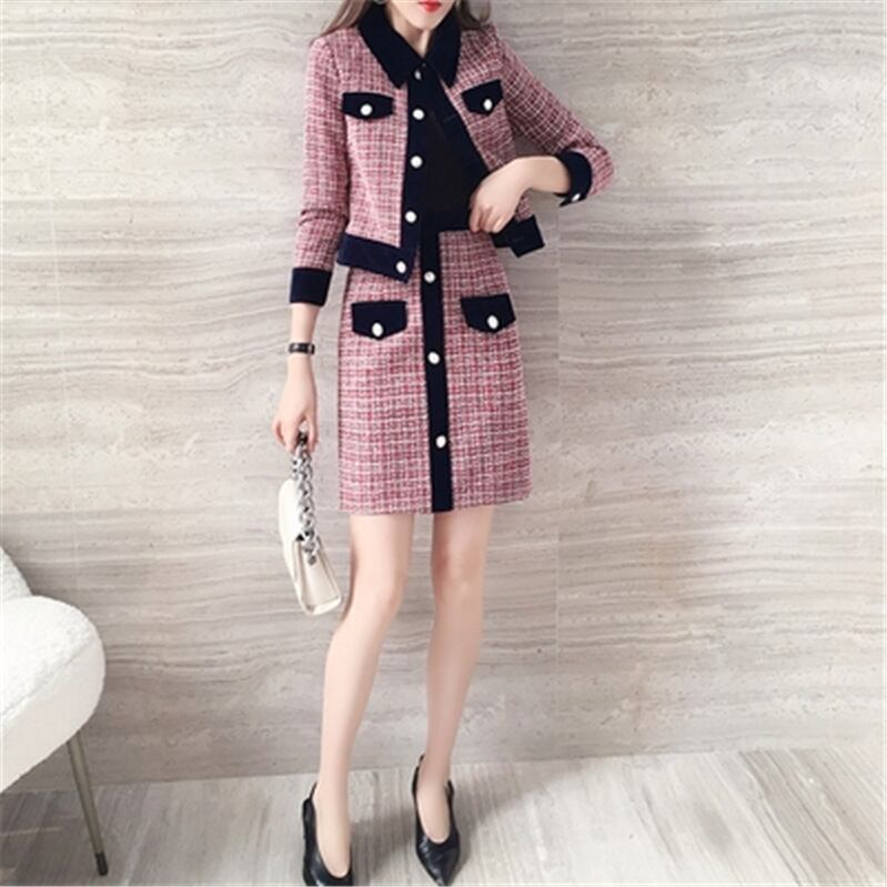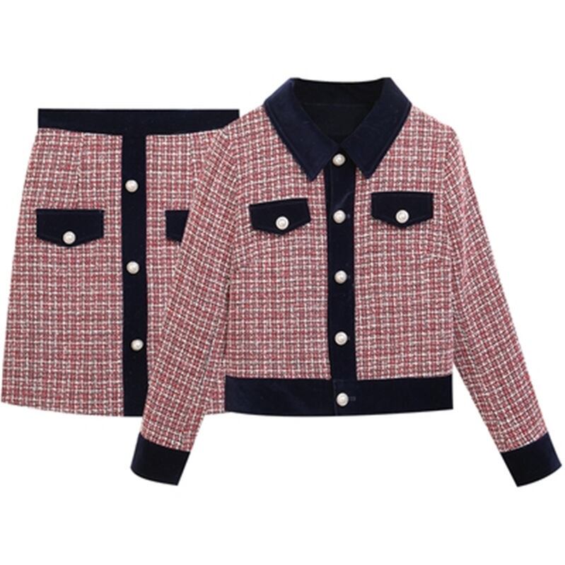 大人可愛いツイードニットトップス+タイトスカートのセットアップ。