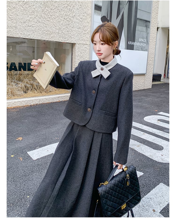 大人可愛いジャケット+プリーツスカートのセットアップ。
