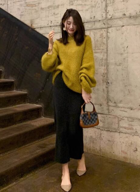 大人エレガントなニットセーター+マーメイドスカートのセットアップ。
