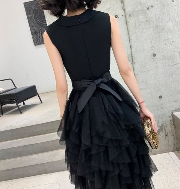 幾重にも重ねられたチュールとウエストのリボンでコーデを引き締める。