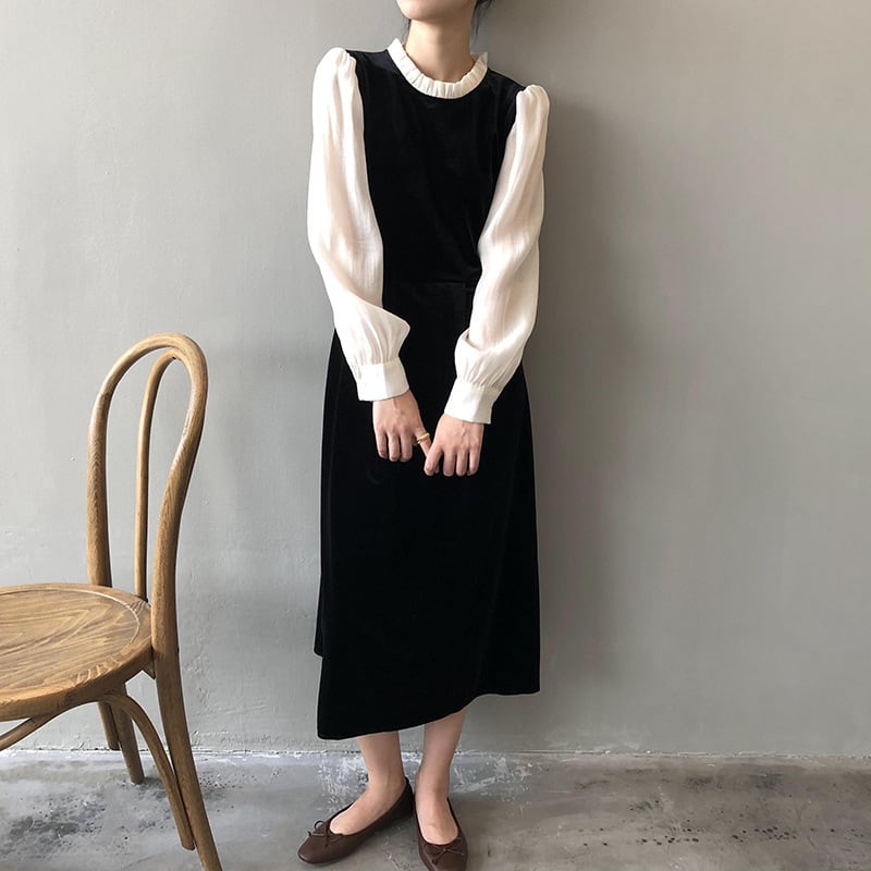 ボリューミーなお袖や襟元のフリルが魅力!のパーティードレス。