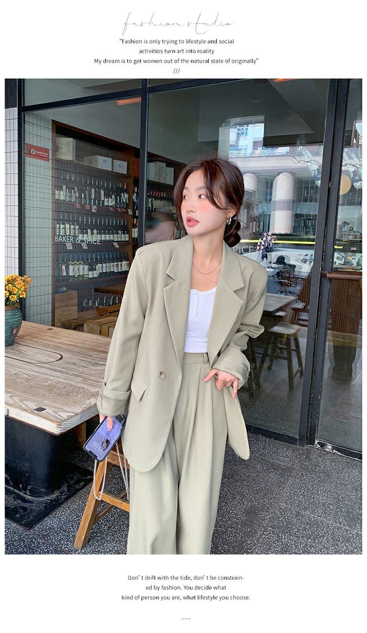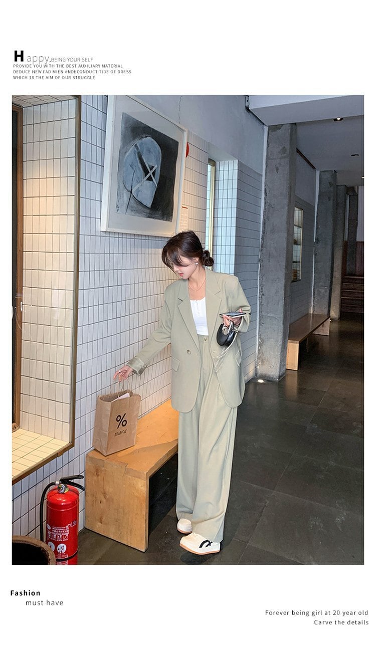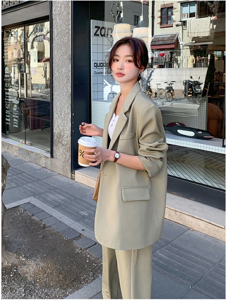 新緑のシーズンにおすすめな人気のグリーンカラーのパンツスーツ。