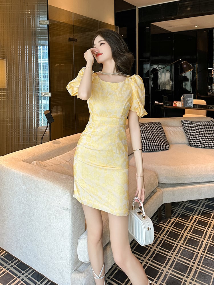 華やぎイエローカラーの花柄ミニ丈パーティードレス。