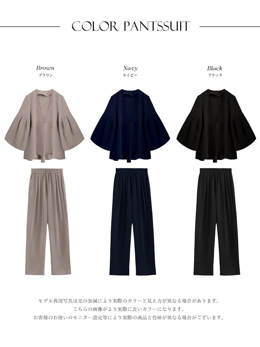 大人エレガントな変形ブラウス+テーパードパンツのセットアップスーツ。