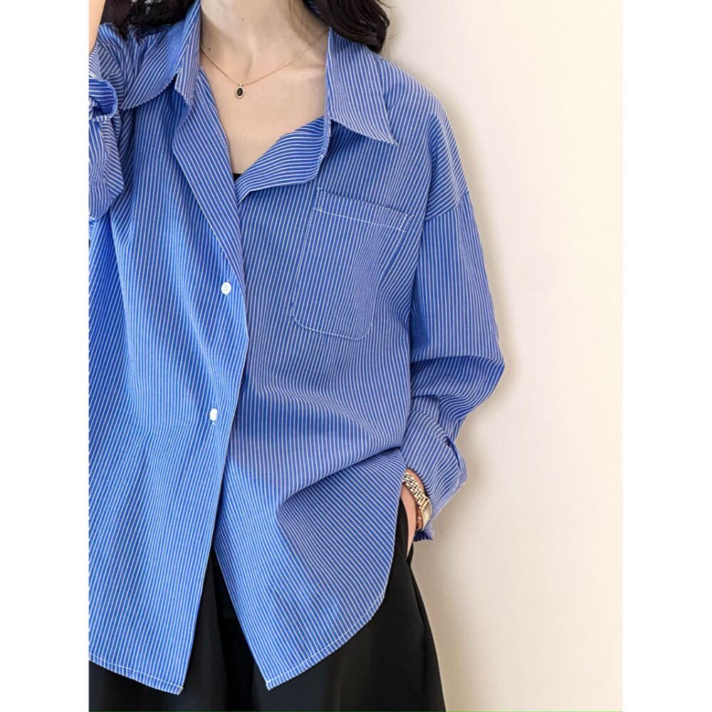 【シャツ】シャツ レディース おしゃれ 長袖 ブラウス トップス シャツ 春 秋 冬 20代 30代 40代 ストライプ カジュアル 可愛い きれいめ シンプル ネイビー 青 M L