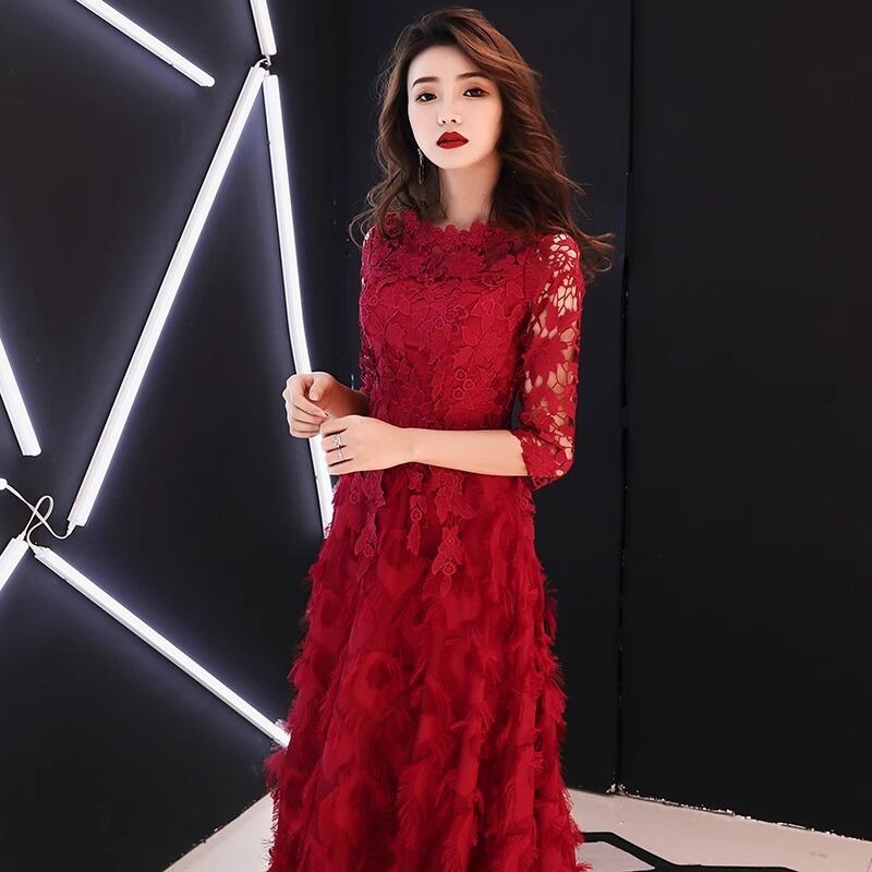 フェザータッチの裾と総レースがエレガントなパーティードレス。