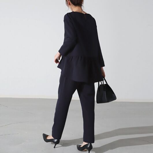 大人エレガントなペプラムトップス+テーパードパンツのセットアップ。