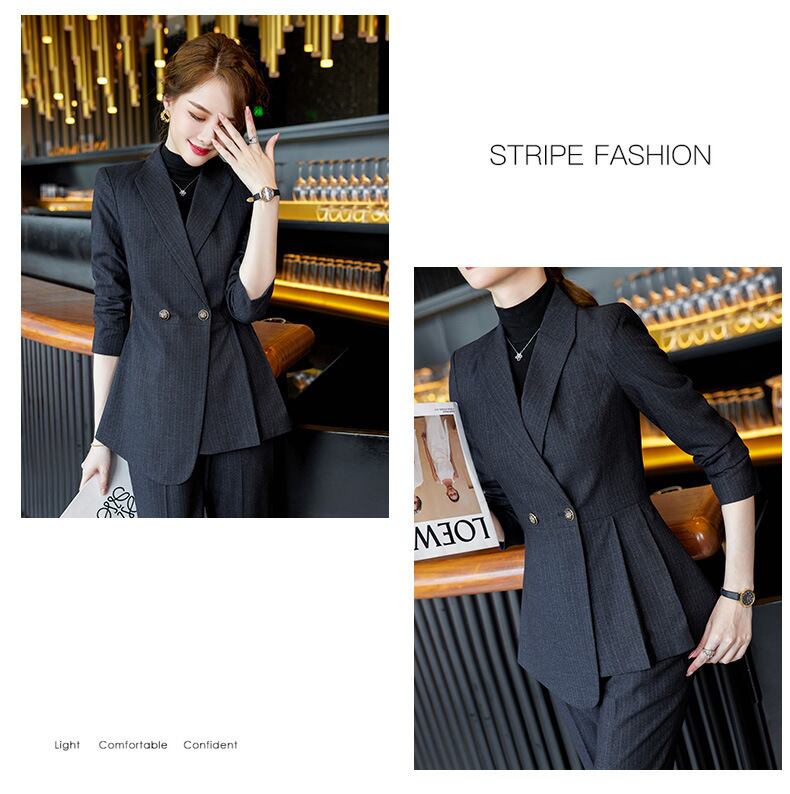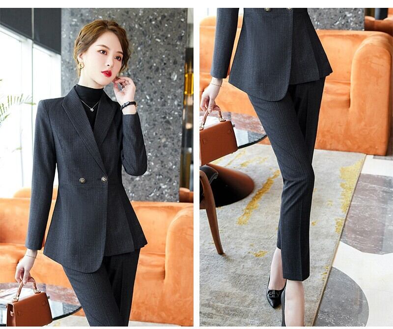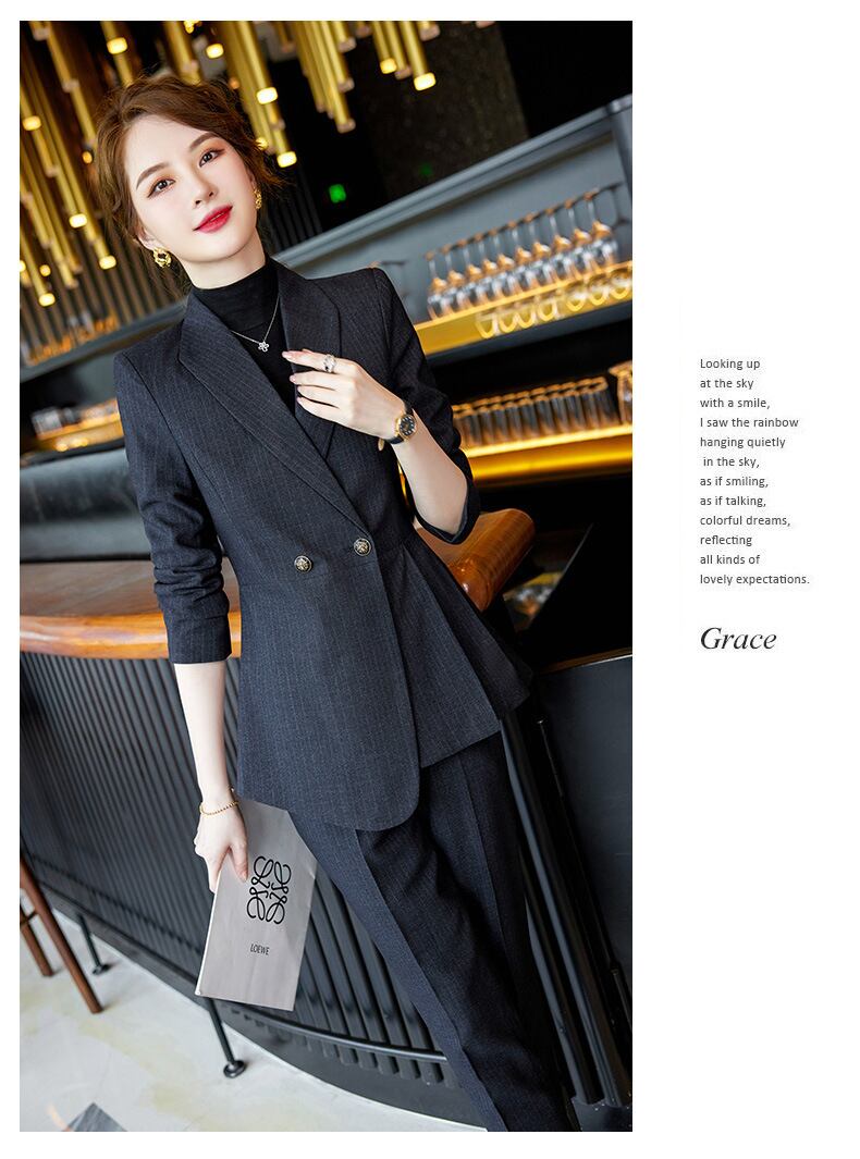 裾のイレギュラーなカッティングが女性らしくドレッシーなパンツスーツ。
