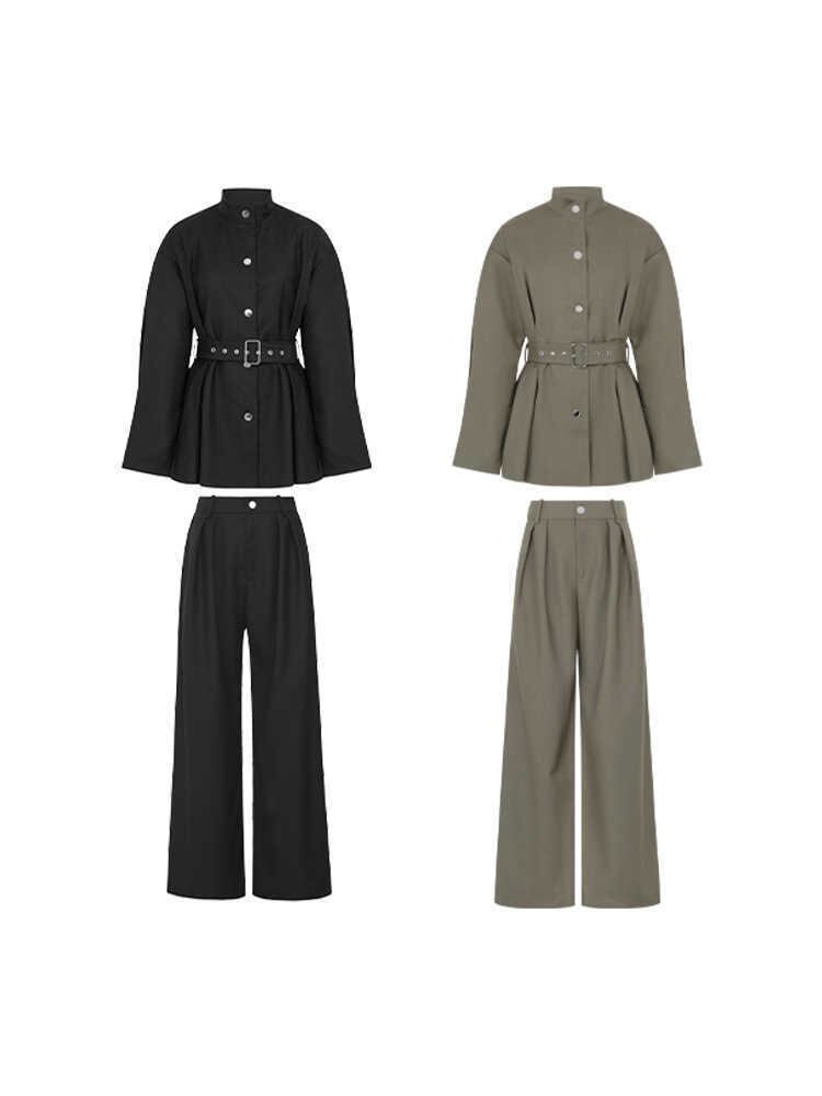 大人かっこいいハイネックトップス+パンツのセットアップパンツドレス。